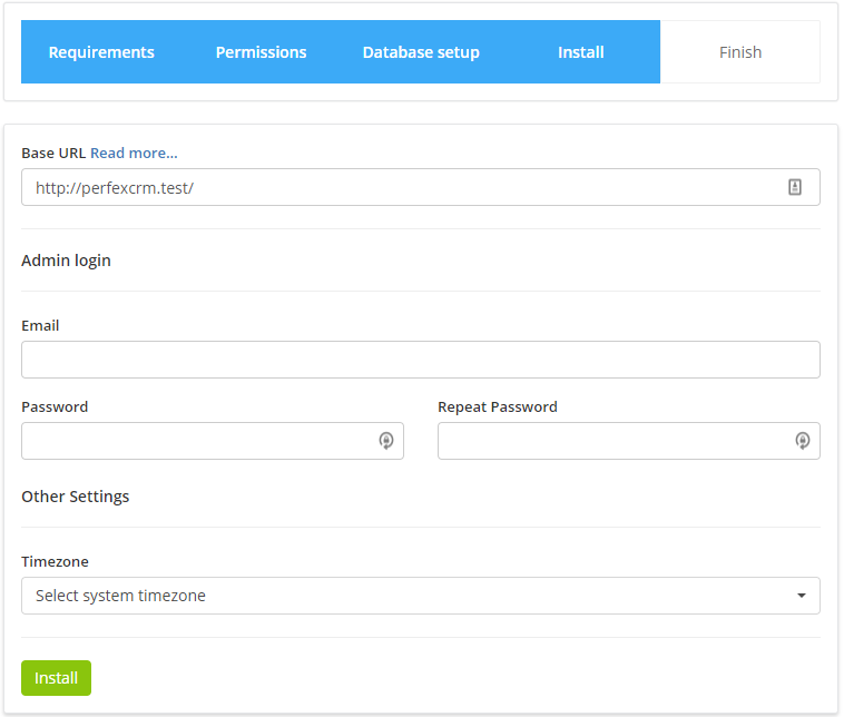 Assume that you uploaded the files to “crm” folder, navigate to eq. http://yourdomain.com/crm/install – Keep in mind that you need to adjust the URL based on where you uploaded the files. If you are installing on subdomain named eq crm you need to access the url like http://crm.yourdomain.com/install.