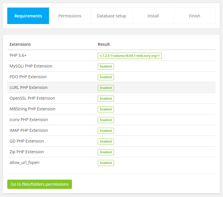 If all server requirements passed click Go to Files/Folders Permissions otherwise consult with your hosting provider to fix/enable them.