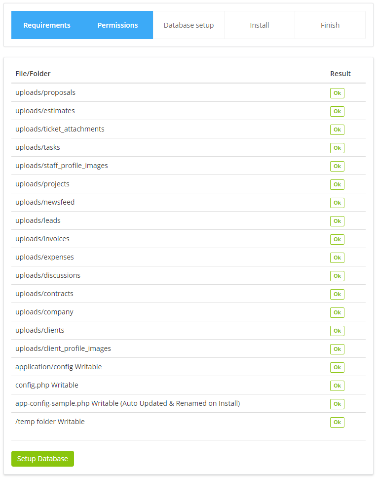 If all permissions are passed click Setup Database otherwise you need to set 755 permissions for folders and 644 for files.